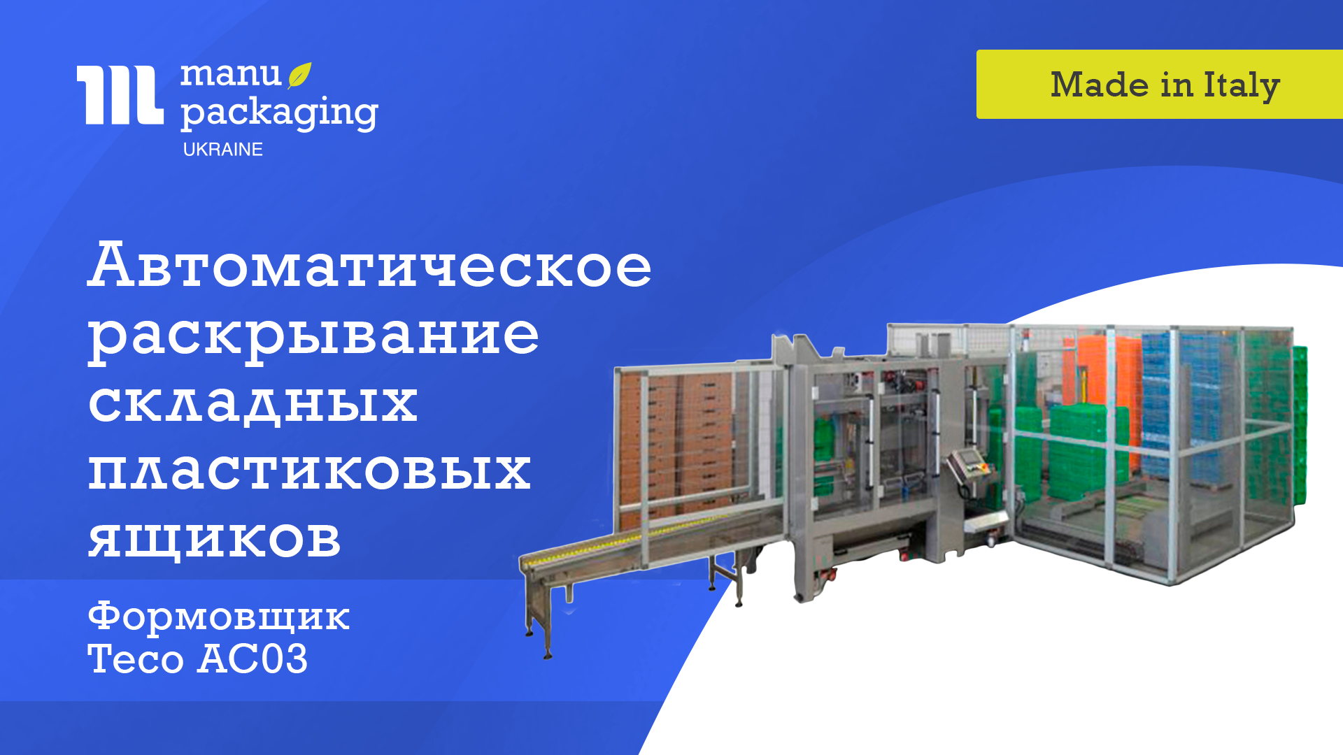AC03 — автоматична система для розкриття складних пластикових ящиків. У машину можна завантажити цілий палет зі складеними ящиками.